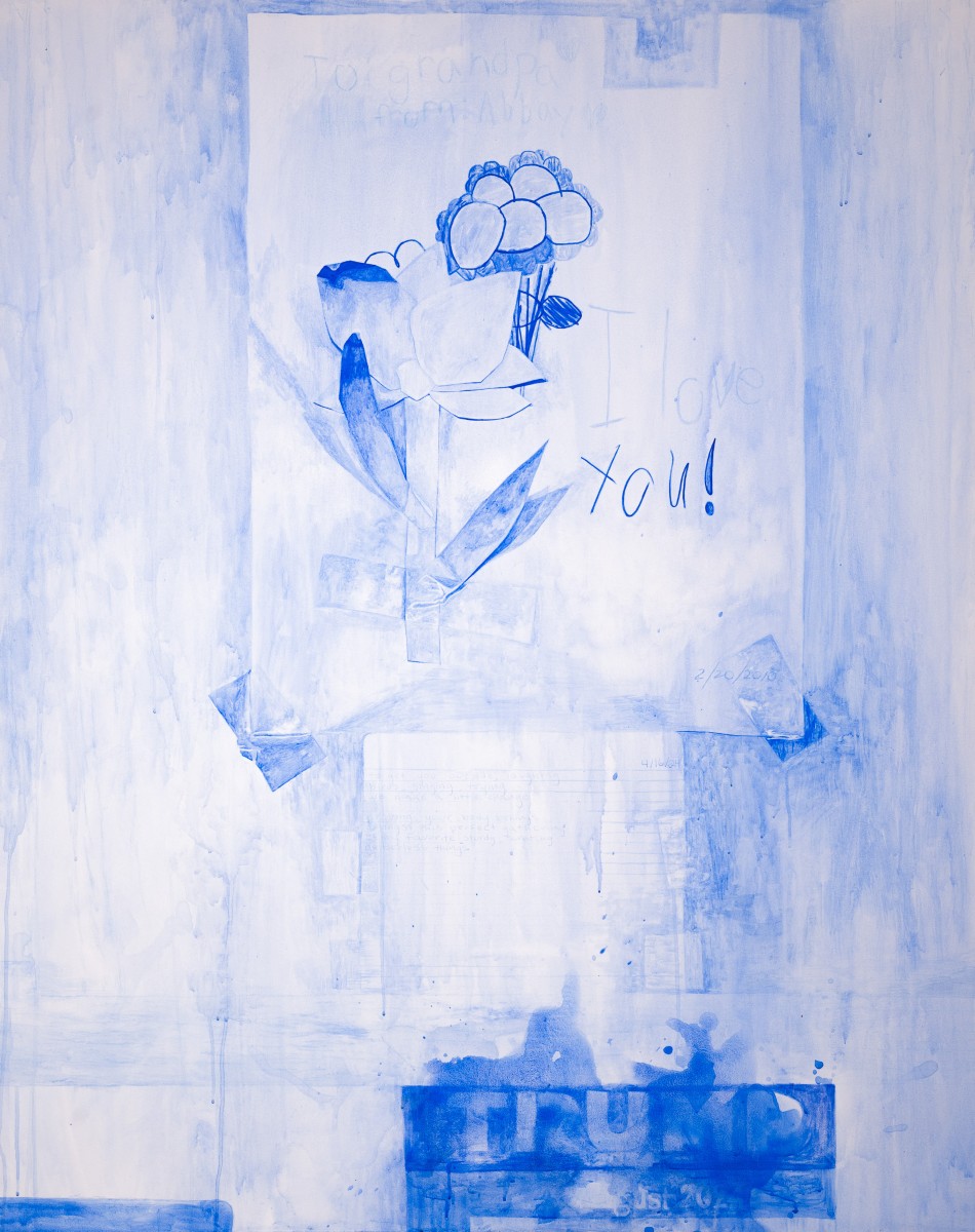 Cyanotype, tissue paper, found paper, pastel, watercolour, coloured pencil on watercolour paper