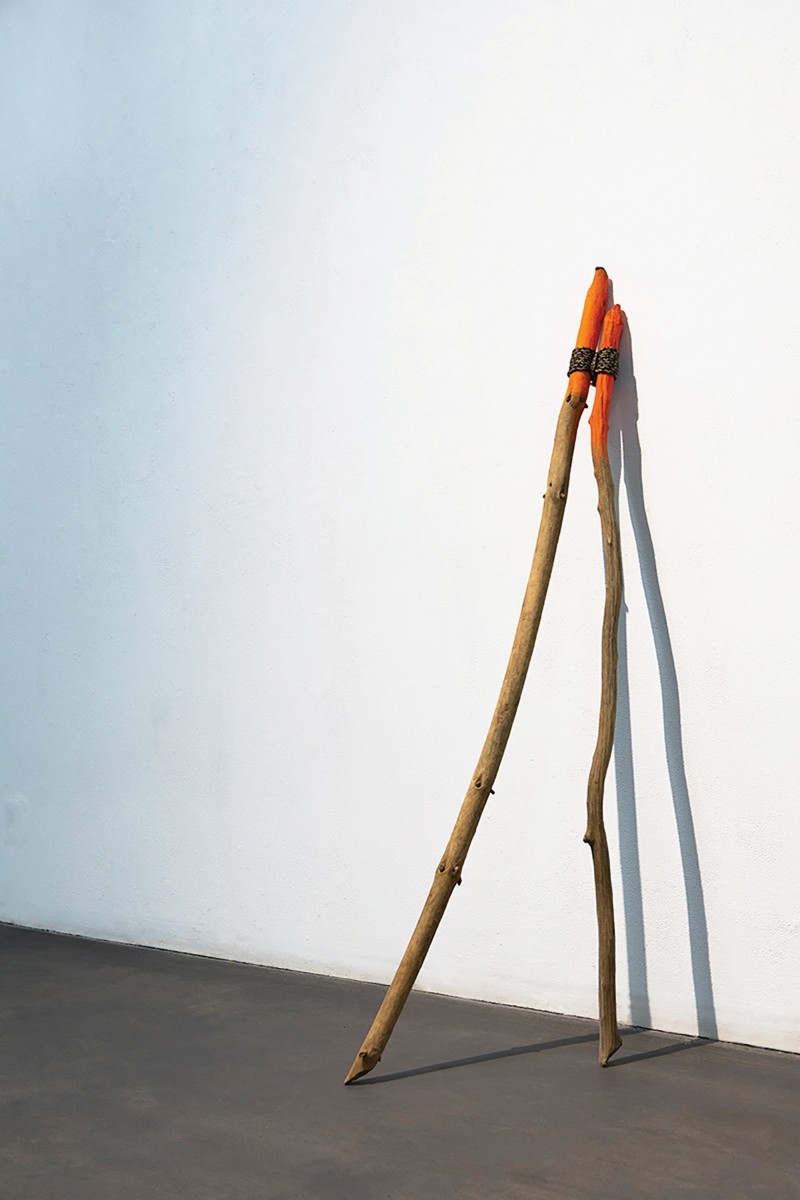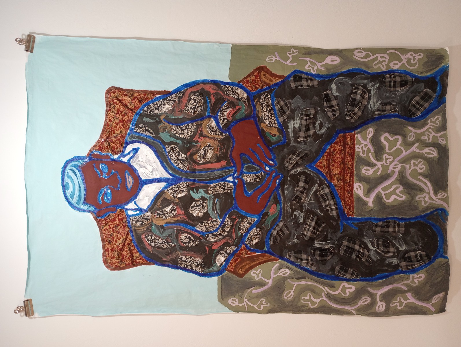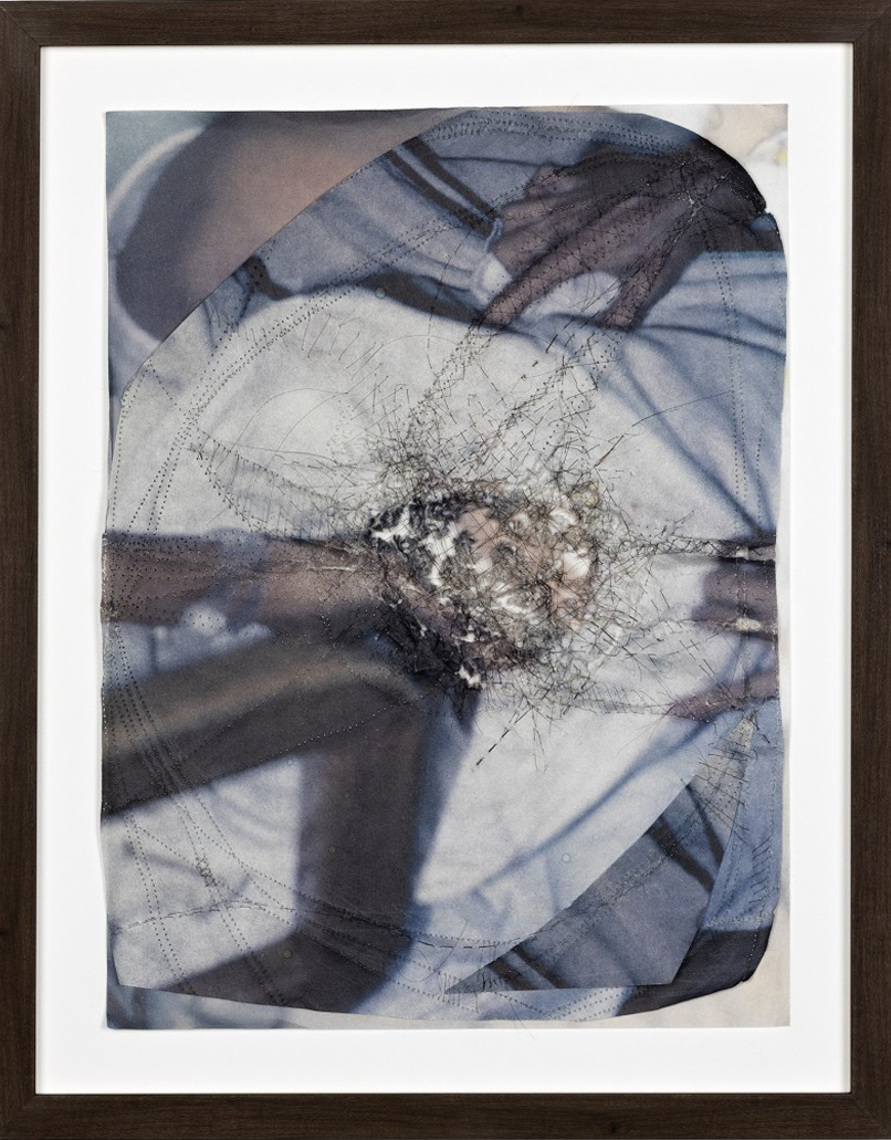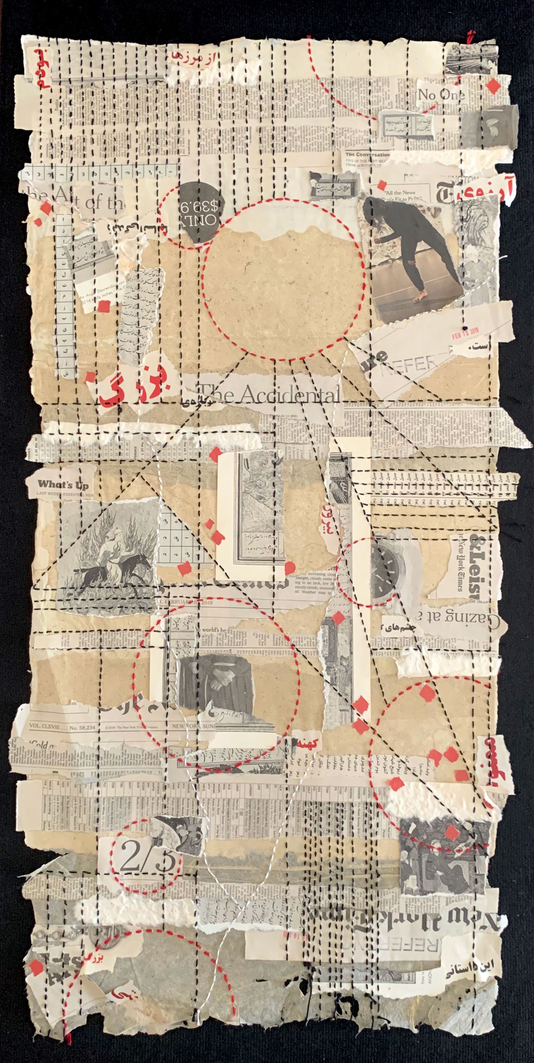 Paper pulp sewn together with embroidery thread and color pencil drawings