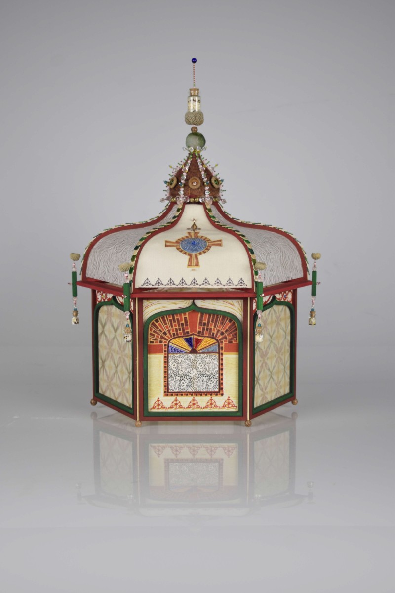 wood, linoleum printed fabric, antique lace, beads, felted wool, acorn hats, glass vials filled with rice and oats