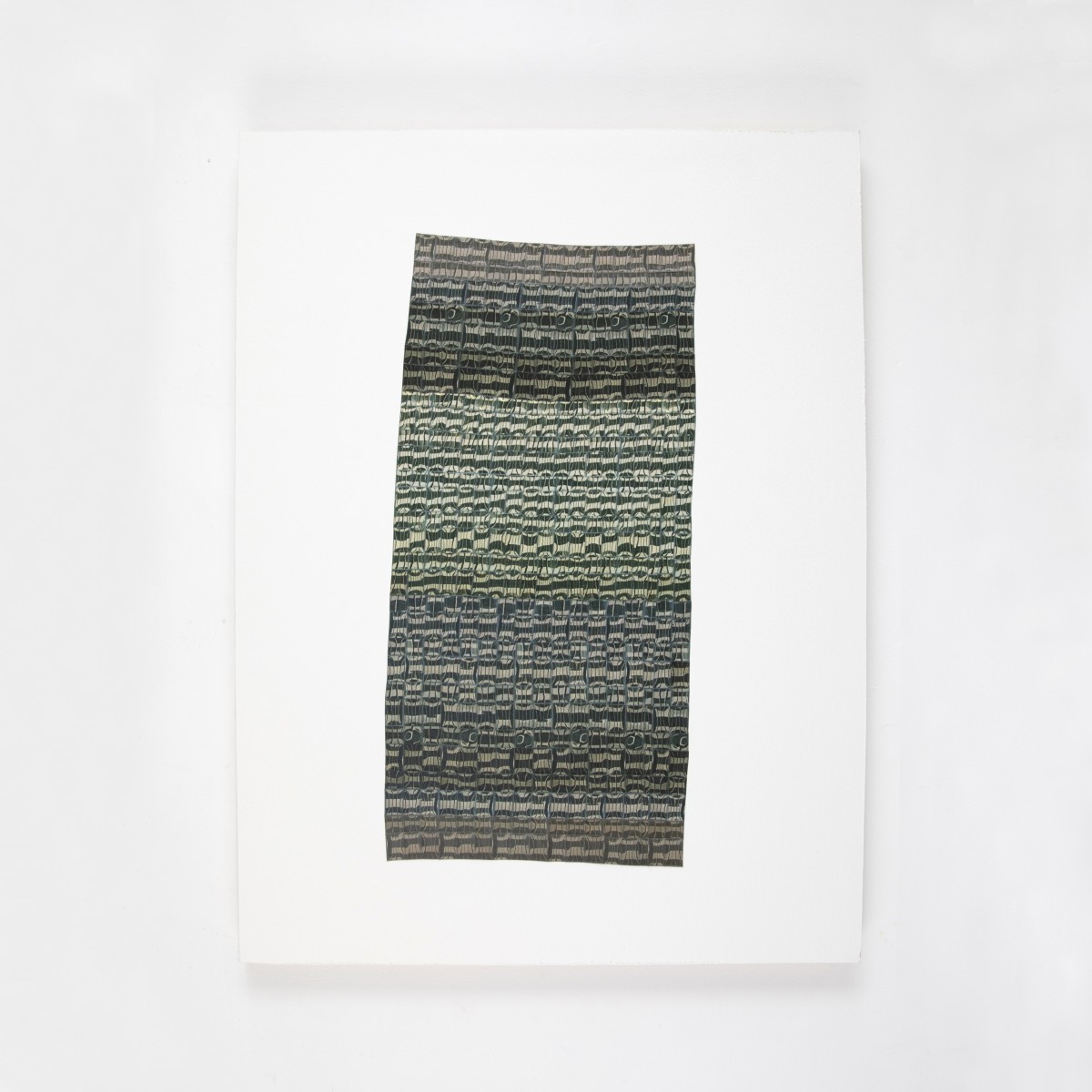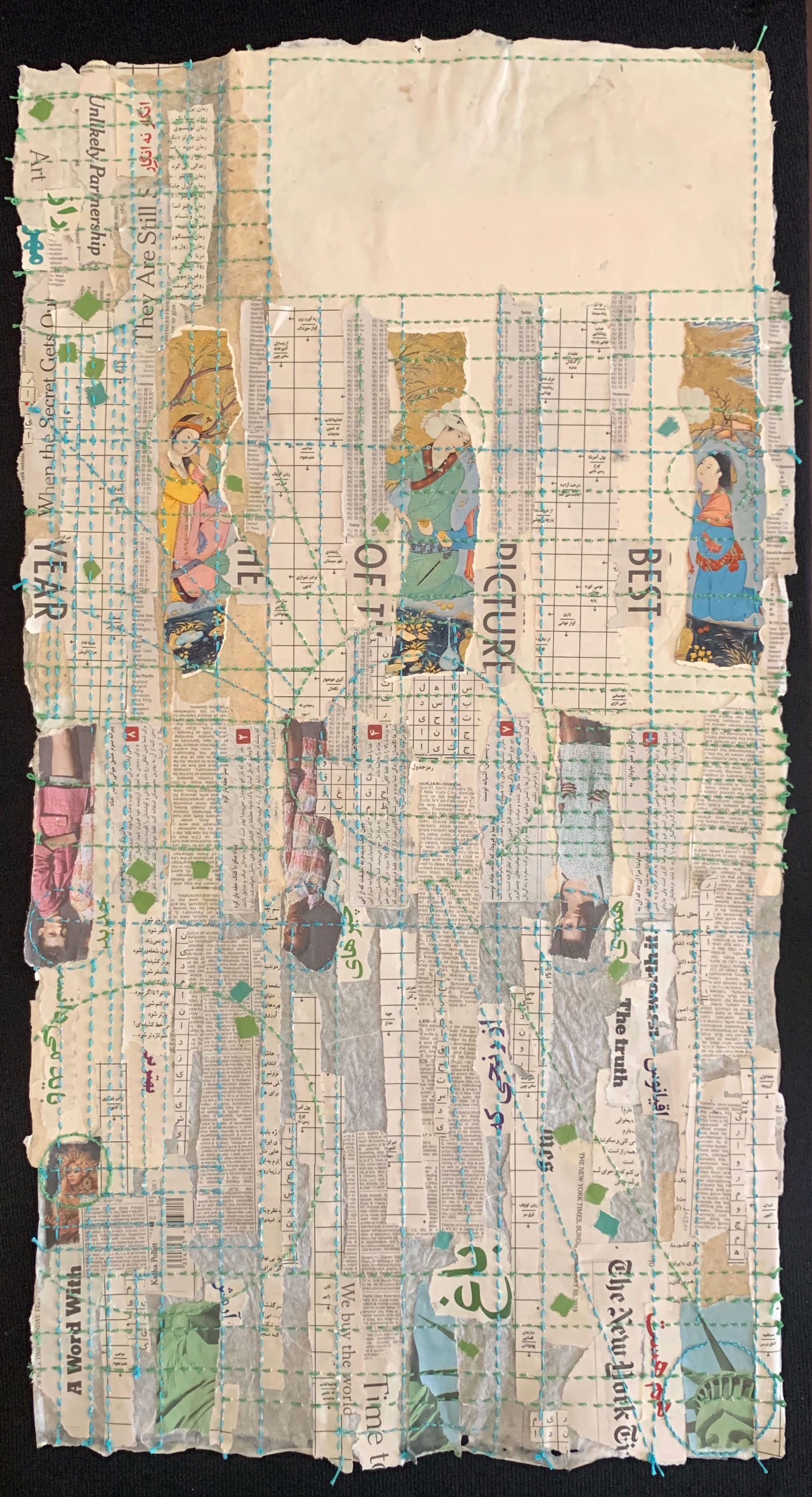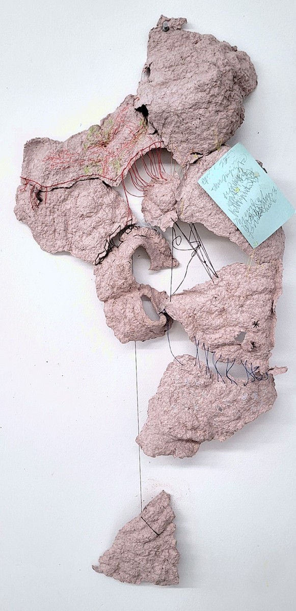 Paper pulp sewn together with embroidery thread and color pencil drawings