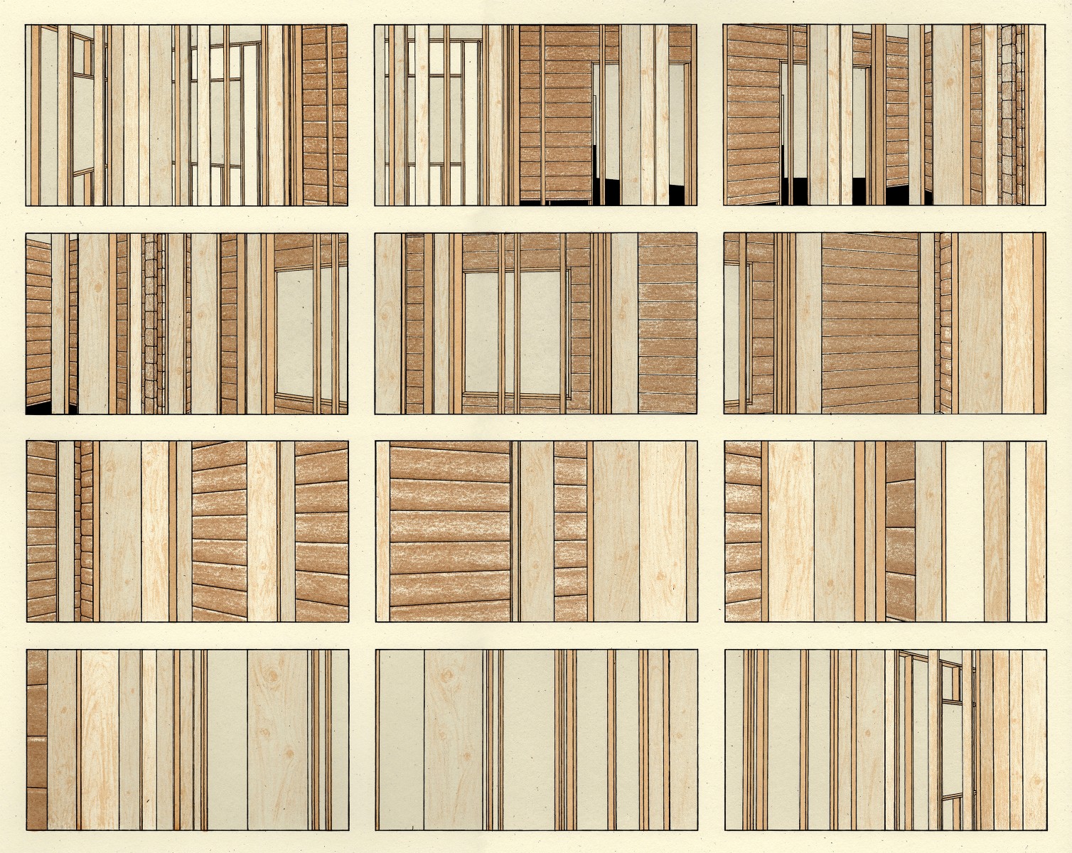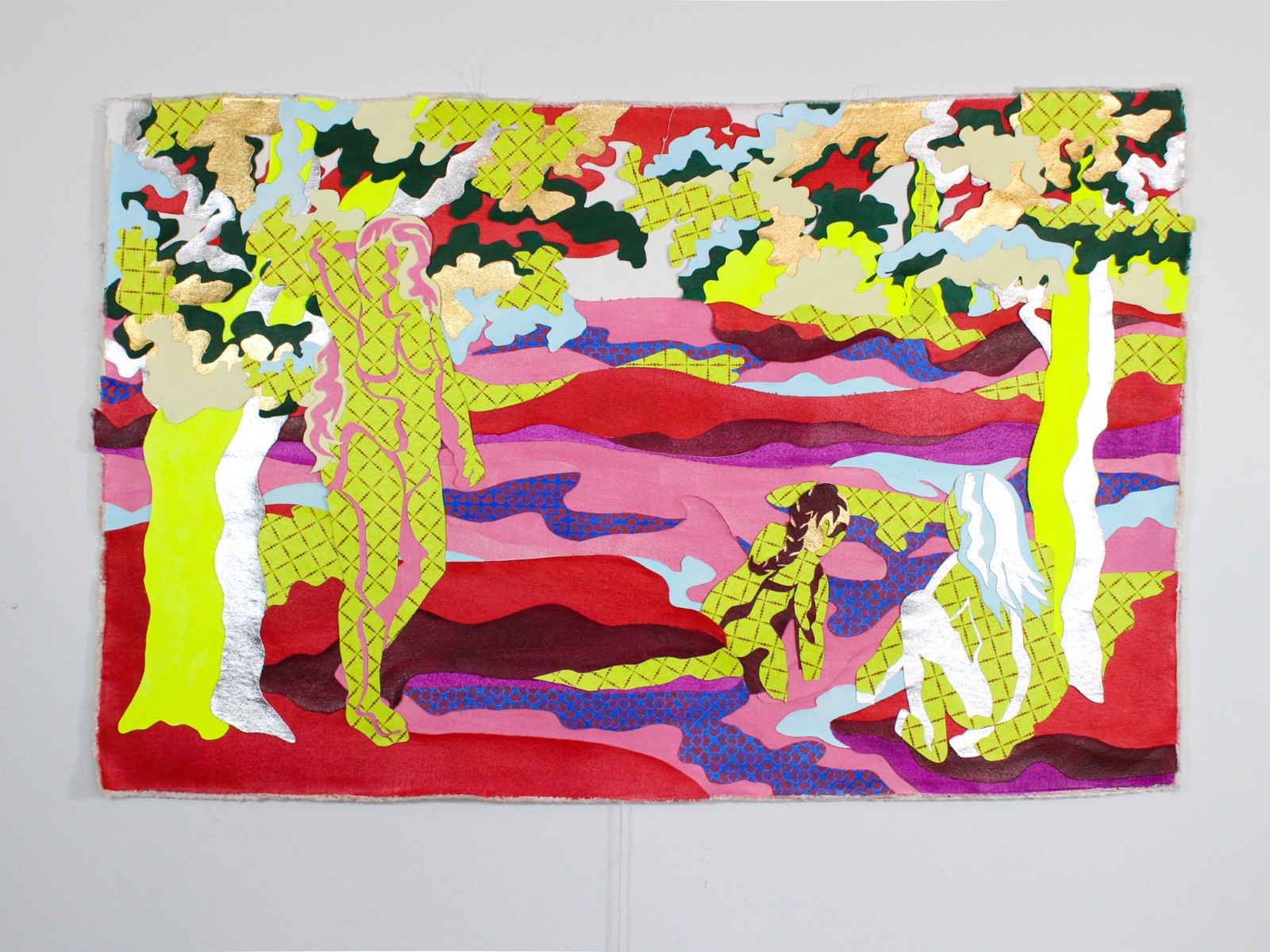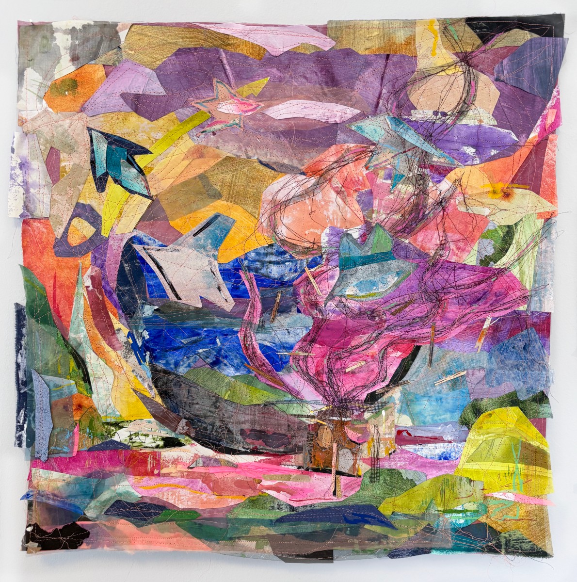 Paper pulp sewn together with embroidery thread and color pencil drawings