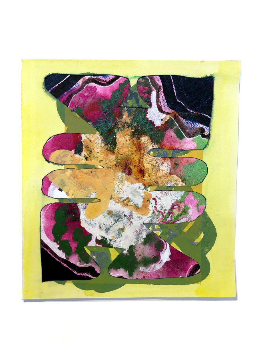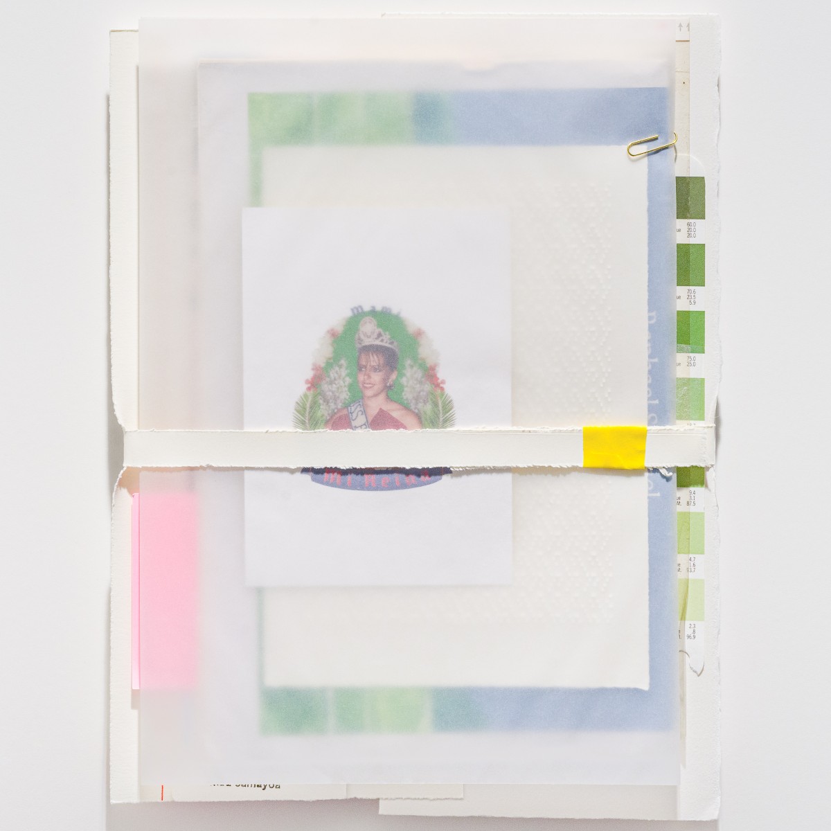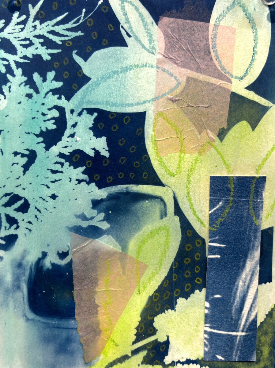 Cyanotype, tissue paper, found paper, pastel, watercolour, coloured pencil on watercolour paper