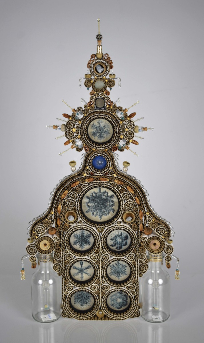 wood, linoleum printed fabric, antique lace, beads, felted wool, acorn hats, glass vials filled with rice and oats